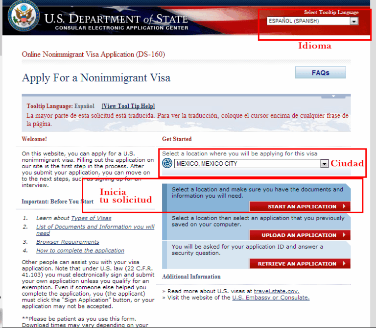 PASO 2: Deberás llenar tu solicitud en línea, dentro de la página podrás cambiar el idioma a español. A continuación selecciona la ciudad desde la que deseas aplicar tu solicitud.